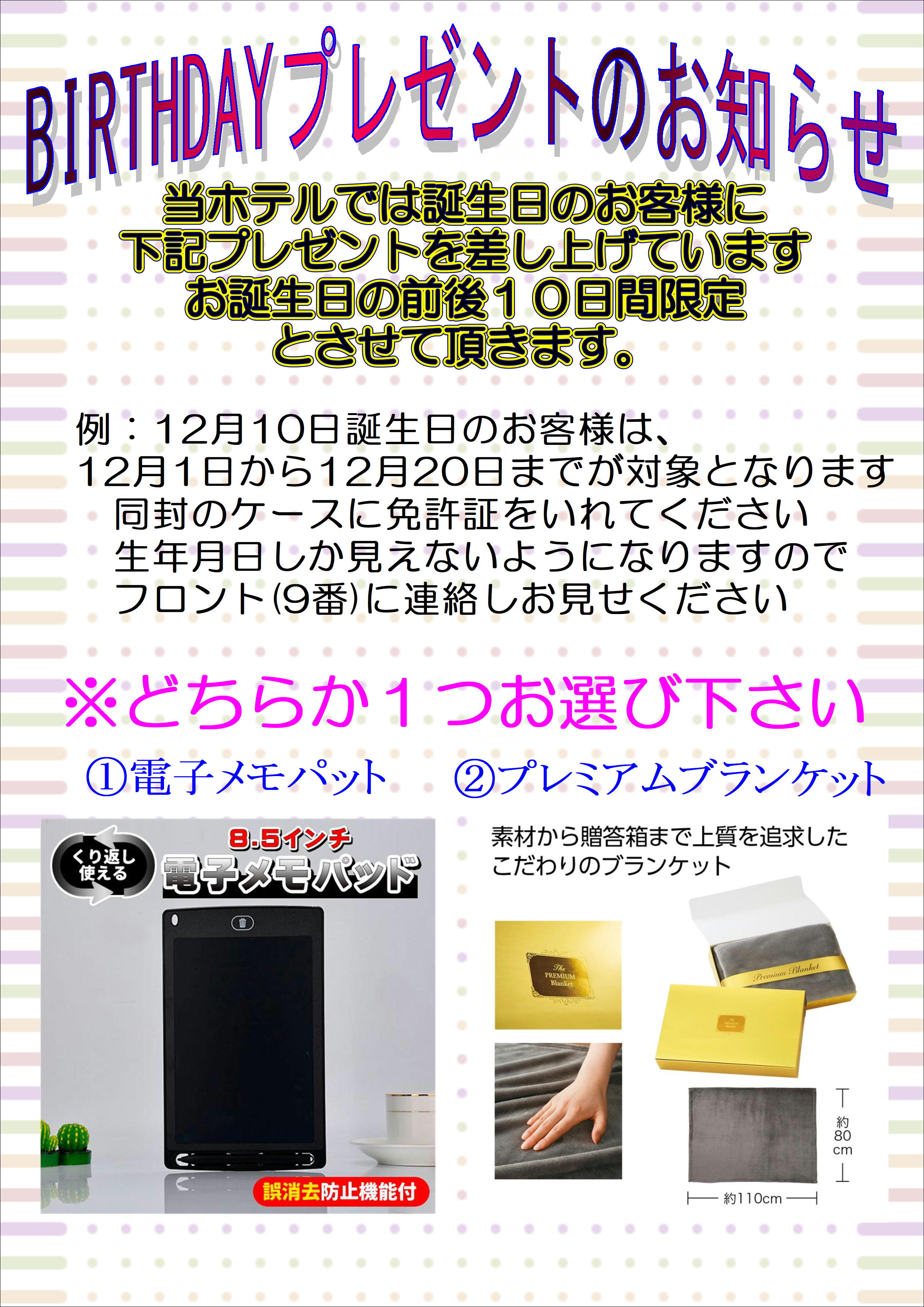当ホテルでは誕生日のお客様に下記のプレゼントを差し上げています。お誕生日の前後10日間限定とさせていただきます。